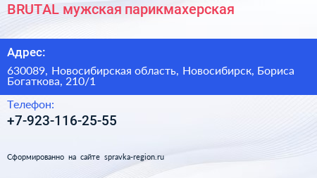 BRUTAL, мужская парикмахерская по адресу 630089, Новосибирская область, Новосибирск, Бориса Богаткова, 210/1 в дальнейшем Организация, размещена в следующих категориях: