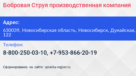 Бобровая Струя, производственная компания по адресу 630039, Новосибирская область, Новосибирск, Дунайская, 122 в дальнейшем Организация, размещена в следующих категориях:
