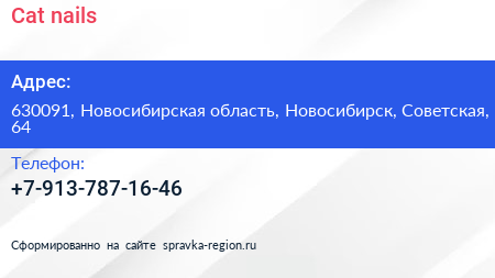 Cat nails по адресу 630091, Новосибирская область, Новосибирск, Советская, 64 в дальнейшем Организация, размещена в следующих категориях: