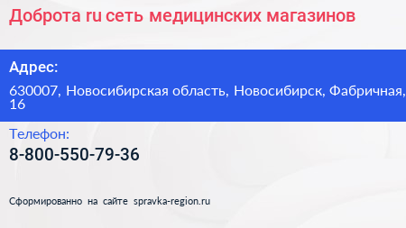 Доброта.ru, сеть медицинских магазинов по адресу 630007, Новосибирская область, Новосибирск, Фабричная, 16 в дальнейшем Организация, размещена в следующих категориях: