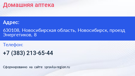 Домашняя, аптека по адресу 630108, Новосибирская область, Новосибирск, проезд Энергетиков, 8 в дальнейшем Организация, размещена в следующих категориях: