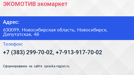 ЭКОМОТИВ, экомаркет по адресу 630099, Новосибирская область, Новосибирск, Депутатская, 48 в дальнейшем Организация, размещена в следующих категориях: