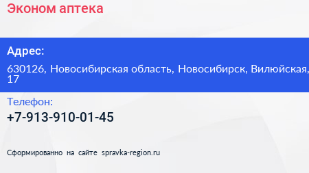 Эконом, аптека по адресу 630126, Новосибирская область, Новосибирск, Вилюйская, 17 в дальнейшем Организация, размещена в следующих категориях: