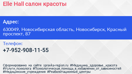 Elle Hall, салон красоты по адресу 630049, Новосибирская область, Новосибирск, Красный проспект, 87 в дальнейшем Организация, размещена в следующих категориях: