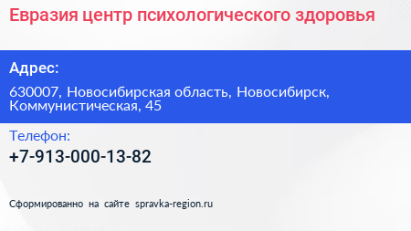 Евразия, центр психологического здоровья по адресу 630007, Новосибирская область, Новосибирск, Коммунистическая, 45 в дальнейшем Организация, размещена в следующих категориях: