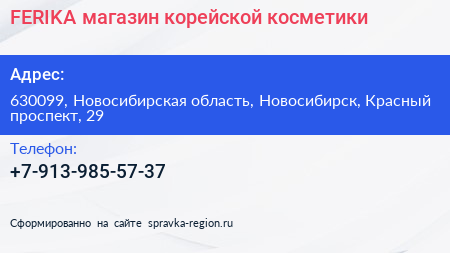 FERIKA, магазин корейской косметики по адресу 630099, Новосибирская область, Новосибирск, Красный проспект, 29 в дальнейшем Организация, размещена в следующих категориях:
