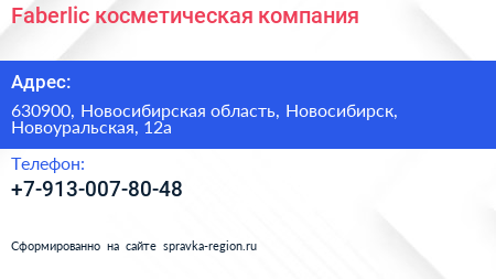 Faberlic, косметическая компания по адресу 630900, Новосибирская область, Новосибирск, Новоуральская, 12а в дальнейшем Организация, размещена в следующих категориях: