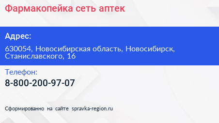 Фармакопейка, сеть аптек по адресу 630054, Новосибирская область, Новосибирск, Станиславского, 16 в дальнейшем Организация, размещена в следующих категориях: