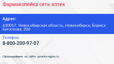 Фармакопейка, сеть аптек по адресу 630017, Новосибирская область, Новосибирск, Бориса Богаткова, 206 в дальнейшем Организация, размещена в следующих категориях: