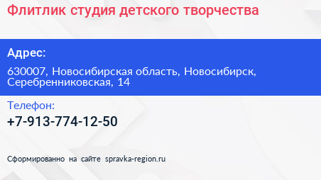 Флитлик, студия детского творчества по адресу 630007, Новосибирская область, Новосибирск, Серебренниковская, 14 в дальнейшем Организация, размещена в следующих категориях: