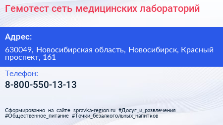 Гемотест, сеть медицинских лабораторий по адресу 630049, Новосибирская область, Новосибирск, Красный проспект, 161 в дальнейшем Организация, размещена в следующих категориях: