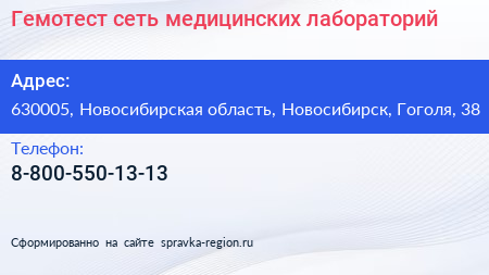Гемотест, сеть медицинских лабораторий по адресу 630005, Новосибирская область, Новосибирск, Гоголя, 38 в дальнейшем Организация, размещена в следующих категориях: