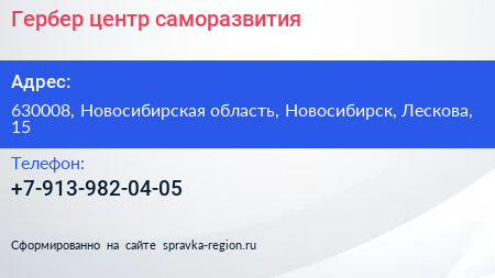 Гербер, центр саморазвития по адресу 630008, Новосибирская область, Новосибирск, Лескова, 15 в дальнейшем Организация, размещена в следующих категориях:
