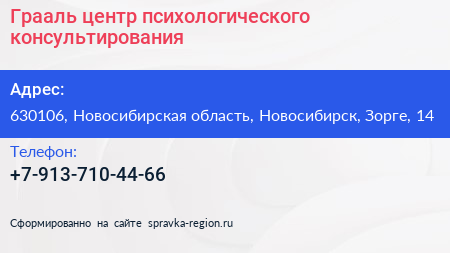 Грааль, центр психологического консультирования по адресу 630106, Новосибирская область, Новосибирск, Зорге, 14 в дальнейшем Организация, размещена в следующих категориях: