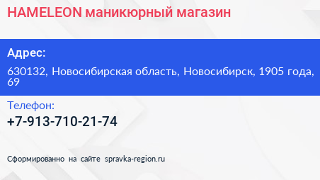 HAMELEON, маникюрный магазин по адресу 630132, Новосибирская область, Новосибирск, 1905 года, 69 в дальнейшем Организация, размещена в следующих категориях: