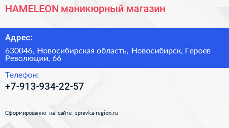 HAMELEON, маникюрный магазин по адресу 630046, Новосибирская область, Новосибирск, Героев Революции, 66 в дальнейшем Организация, размещена в следующих категориях: