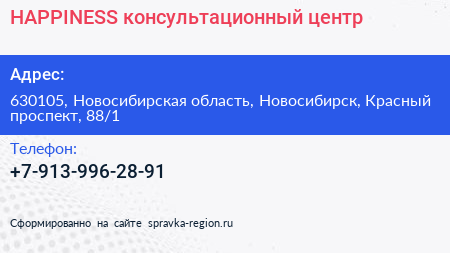 HAPPINESS, консультационный центр по адресу 630105, Новосибирская область, Новосибирск, Красный проспект, 88/1 в дальнейшем Организация, размещена в следующих категориях: