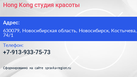 Hong Kong, студия красоты по адресу 630079, Новосибирская область, Новосибирск, Костычева, 74/1 в дальнейшем Организация, размещена в следующих категориях:
