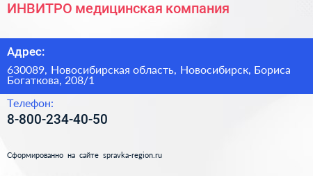 ИНВИТРО, медицинская компания по адресу 630089, Новосибирская область, Новосибирск, Бориса Богаткова, 208/1 в дальнейшем Организация, размещена в следующих категориях: