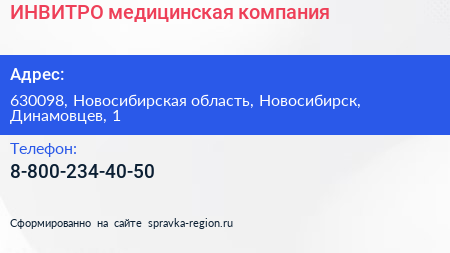 ИНВИТРО, медицинская компания по адресу 630098, Новосибирская область, Новосибирск, Динамовцев, 1 в дальнейшем Организация, размещена в следующих категориях:
