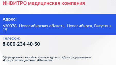 ИНВИТРО, медицинская компания по адресу 630078, Новосибирская область, Новосибирск, Ватутина, 19 в дальнейшем Организация, размещена в следующих категориях: