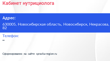 Кабинет нутрициолога по адресу 630005, Новосибирская область, Новосибирск, Некрасова, 82 в дальнейшем Организация, размещена в следующих категориях: