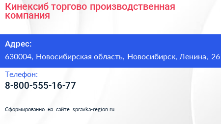 Кинексиб, торгово-производственная компания по адресу 630004, Новосибирская область, Новосибирск, Ленина, 26 в дальнейшем Организация, размещена в следующих категориях: