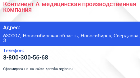 Континент А, медицинская производственная компания по адресу 630007, Новосибирская область, Новосибирск, Свердлова, 3 в дальнейшем Организация, размещена в следующих категориях:
