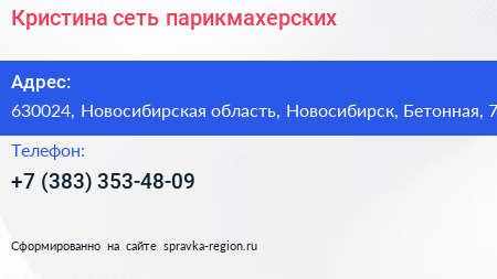 Кристина, сеть парикмахерских по адресу 630024, Новосибирская область, Новосибирск, Бетонная, 7 в дальнейшем Организация, размещена в следующих категориях: