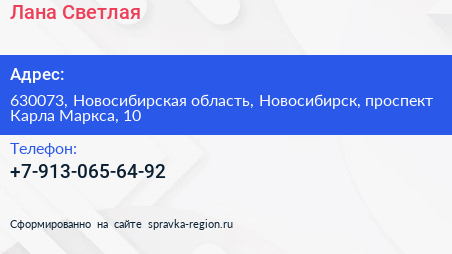Лана Светлая по адресу 630073, Новосибирская область, Новосибирск, проспект Карла Маркса, 10 в дальнейшем Организация, размещена в следующих категориях: