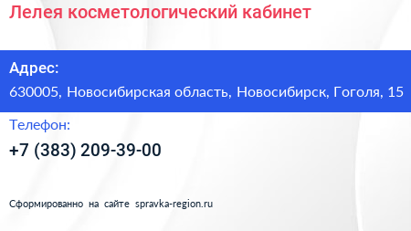 Лелея, косметологический кабинет по адресу 630005, Новосибирская область, Новосибирск, Гоголя, 15 в дальнейшем Организация, размещена в следующих категориях: