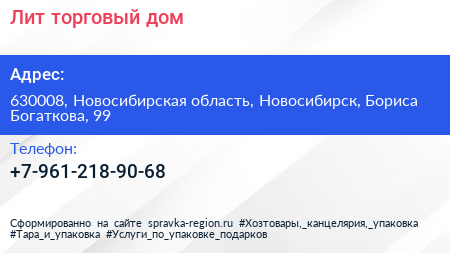 Лит, торговый дом по адресу 630008, Новосибирская область, Новосибирск, Бориса Богаткова, 99 в дальнейшем Организация, размещена в следующих категориях: