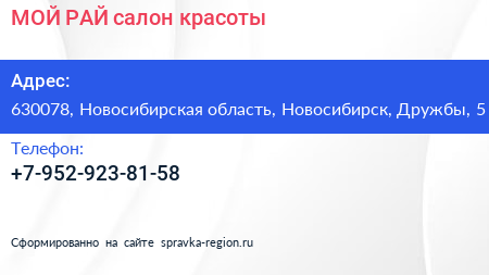 МОЙ РАЙ, салон красоты по адресу 630078, Новосибирская область, Новосибирск, Дружбы, 5 в дальнейшем Организация, размещена в следующих категориях: