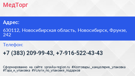 МедТорг по адресу 630112, Новосибирская область, Новосибирск, Фрунзе, 242 в дальнейшем Организация, размещена в следующих категориях: