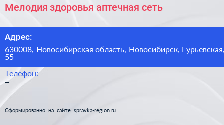 Мелодия здоровья, аптечная сеть по адресу 630008, Новосибирская область, Новосибирск, Гурьевская, 55 в дальнейшем Организация, размещена в следующих категориях: