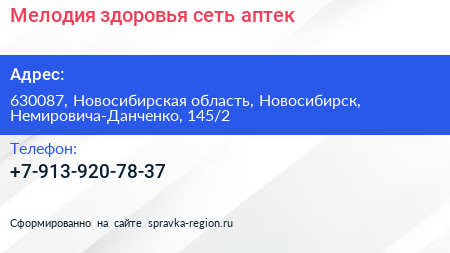 Мелодия здоровья, сеть аптек по адресу 630087, Новосибирская область, Новосибирск, Немировича-Данченко, 145/2 в дальнейшем Организация, размещена в следующих категориях: