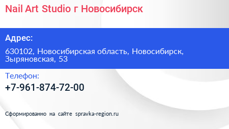 Nail Art Studio, г. Новосибирск по адресу 630102, Новосибирская область, Новосибирск, Зыряновская, 53 в дальнейшем Организация, размещена в следующих категориях: