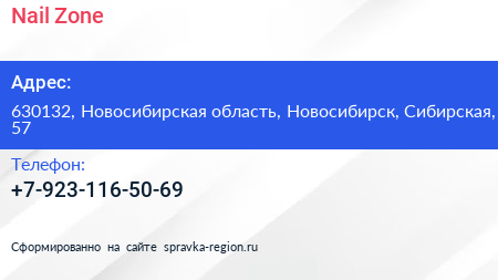 Nail Zone по адресу 630132, Новосибирская область, Новосибирск, Сибирская, 57 в дальнейшем Организация, размещена в следующих категориях: