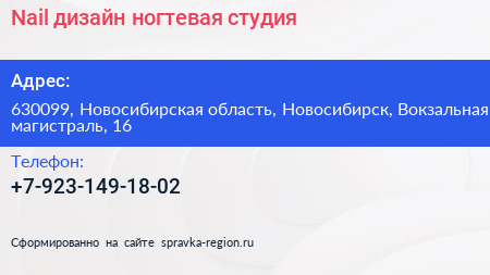 Nail-дизайн, ногтевая студия по адресу 630099, Новосибирская область, Новосибирск, Вокзальная магистраль, 16 в дальнейшем Организация, размещена в следующих категориях: