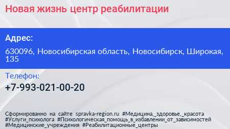 Новая жизнь, центр реабилитации по адресу 630096, Новосибирская область, Новосибирск, Широкая, 135 в дальнейшем Организация, размещена в следующих категориях: