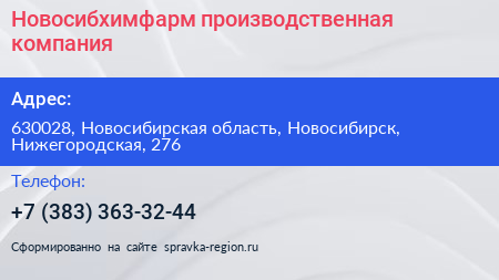 Новосибхимфарм, производственная компания по адресу 630028, Новосибирская область, Новосибирск, Нижегородская, 276 в дальнейшем Организация, размещена в следующих категориях: