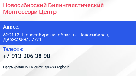 Новосибирский Билингвистический Монтессори-Центр по адресу 630112, Новосибирская область, Новосибирск, Державина, 77/1 в дальнейшем Организация, размещена в следующих категориях: