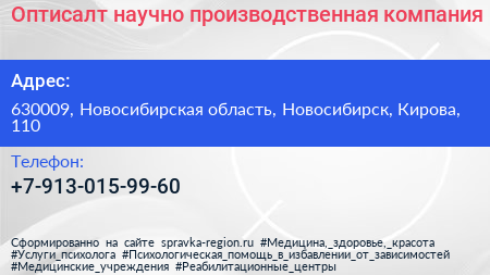 Оптисалт, научно-производственная компания по адресу 630009, Новосибирская область, Новосибирск, Кирова, 110 в дальнейшем Организация, размещена в следующих категориях: