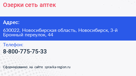 Озерки, сеть аптек по адресу 630022, Новосибирская область, Новосибирск, 3-й Бронный переулок, 44 в дальнейшем Организация, размещена в следующих категориях: