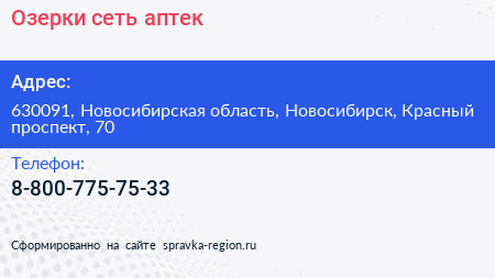 Озерки, сеть аптек по адресу 630091, Новосибирская область, Новосибирск, Красный проспект, 70 в дальнейшем Организация, размещена в следующих категориях: