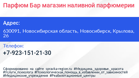 Парфюм Бар, магазин наливной парфюмерии по адресу 630091, Новосибирская область, Новосибирск, Крылова, 26 в дальнейшем Организация, размещена в следующих категориях: