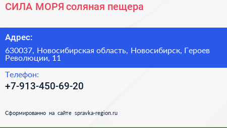 СИЛА МОРЯ, соляная пещера по адресу 630037, Новосибирская область, Новосибирск, Героев Революции, 11 в дальнейшем Организация, размещена в следующих категориях: