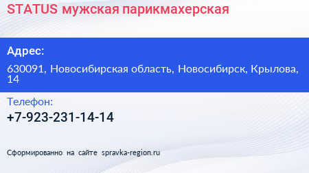 STATUS, мужская парикмахерская по адресу 630091, Новосибирская область, Новосибирск, Крылова, 14 в дальнейшем Организация, размещена в следующих категориях: