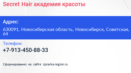 Secret Hair, академия красоты по адресу 630091, Новосибирская область, Новосибирск, Советская, 64 в дальнейшем Организация, размещена в следующих категориях: