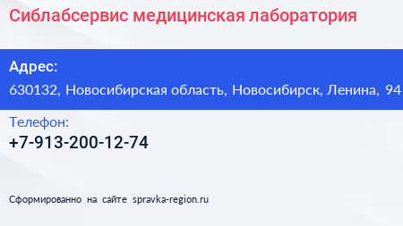 Сиблабсервис, медицинская лаборатория по адресу 630132, Новосибирская область, Новосибирск, Ленина, 94 в дальнейшем Организация, размещена в следующих категориях: